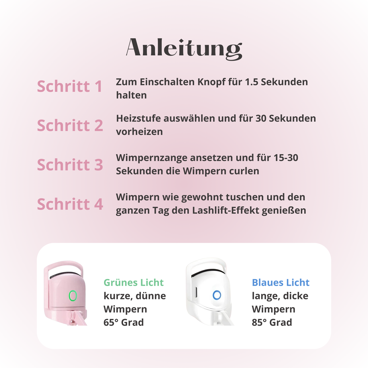 Die Anwendung ist ganz einfach: Halte den Knopf 1,5 Sekunden lang gedrückt, wähle die gewünschte Stufe und warte, bis das Anti-Einklemm-Silikon von Dunkelgrau auf Hellgrau wechselt. Sobald die Farbe geändert ist, biege die Wimpern für 15-30 Sekunden.